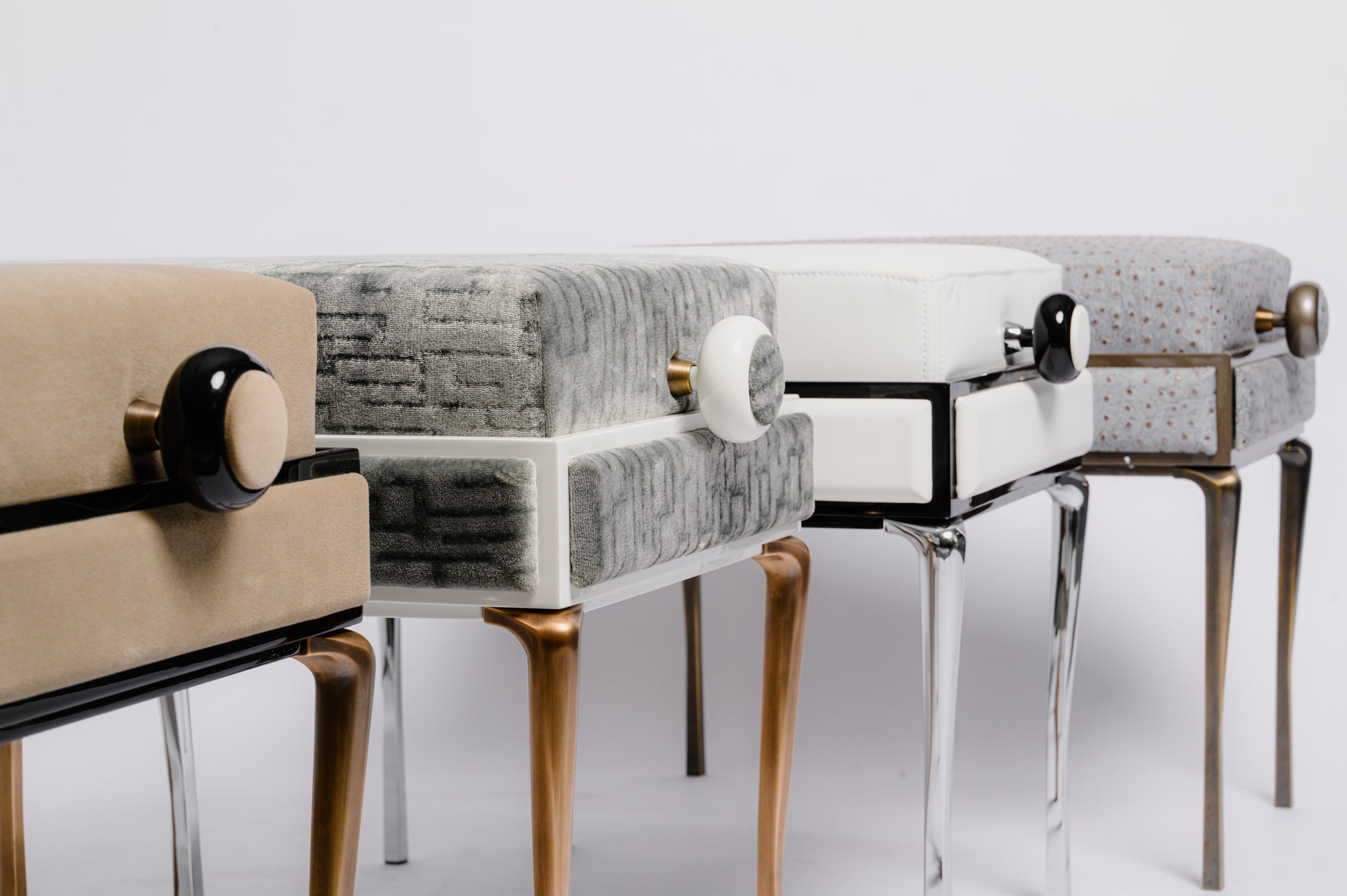 Materials: upholstered seat (leather or fabric); optional paneling in wood or leather; internal steel adjustment mechanism; metal legs